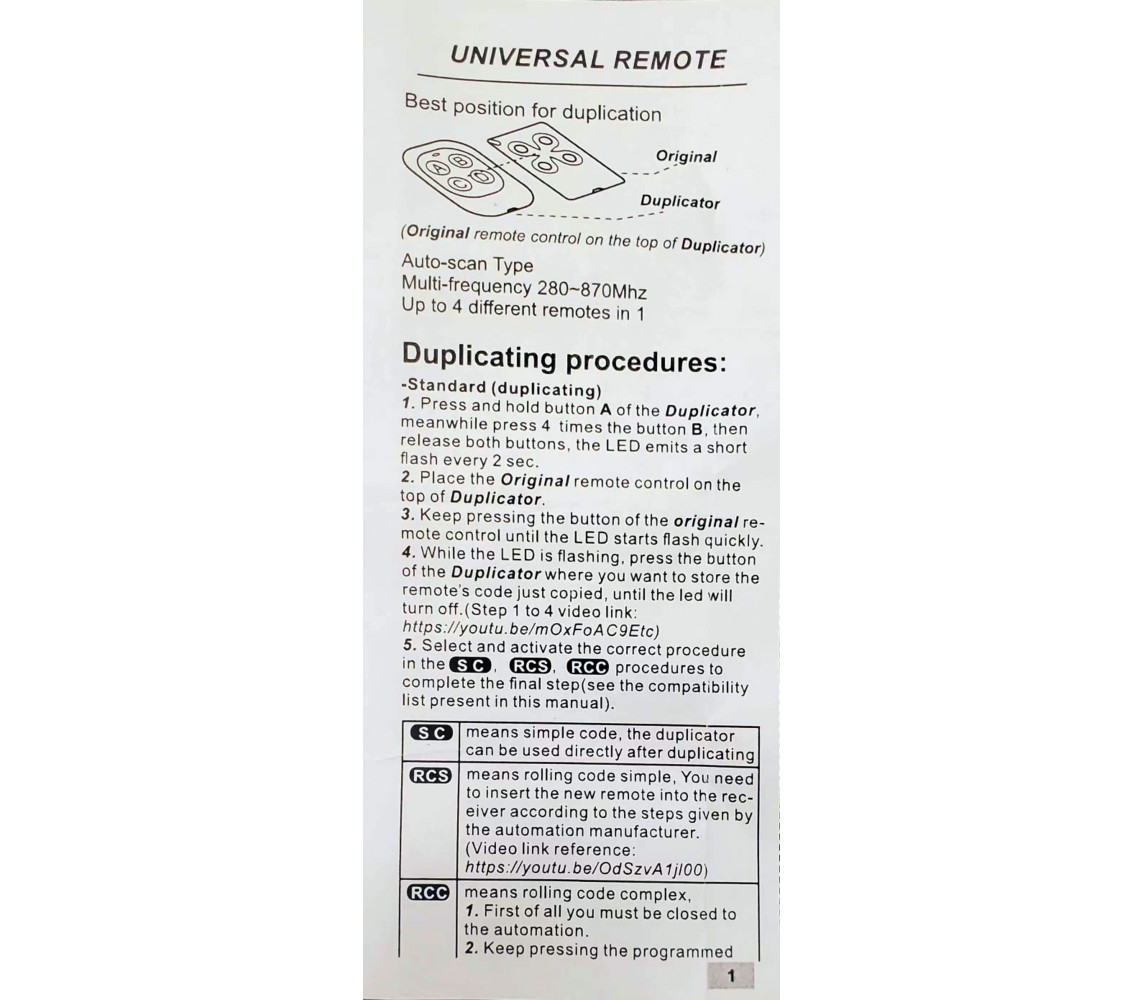 Univerzalni programabilni daljinski upravljač sa 4 tastera namenjen za garažna vrata, klizne kapije, rolo vrata, roletne i razne sisteme automatike. Podržava plivajući kod i širok opseg frekvencija, što omogućava kompatibilnost sa velikim brojem brendova i uređaja.
